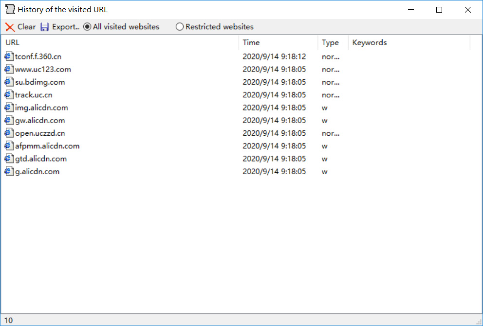 - Click the [Export] button to save the URL record as a text file for viewing later.