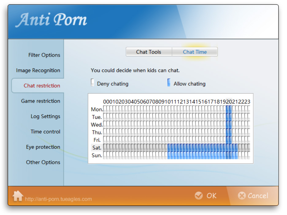 The time table includes 7 rows and 48 columns, each row represents a certain day of the week, and each column represents half an hour. Each cell of the table contains a small button. You can click these small buttons to switch their status. When the button is gray, it means that children are not allowed to chat online during this period; when the button is blue, it means that children are allowed to chat online during this period.