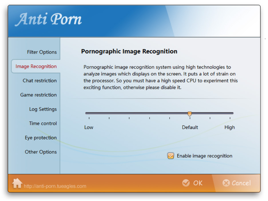 You can set the sensitivity of the adult image recognition function by adjusting the position of the slide bar. The higher the sensitivity, the higher the false positive rate.