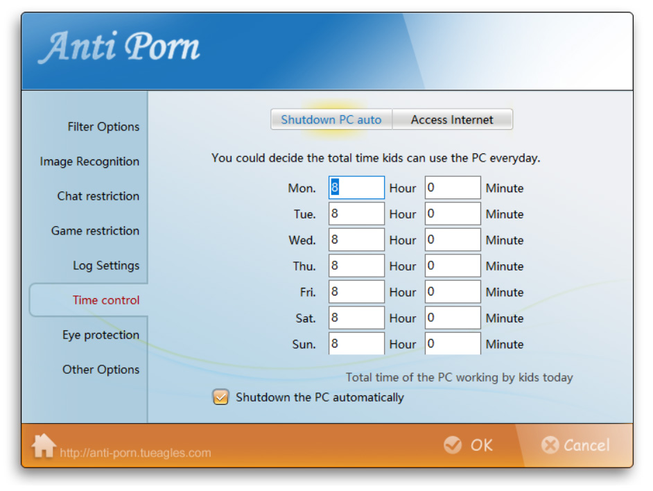 You can set the total time that your child is allowed to use the computer every day. After the time has elapsed, the Tueagles Anti Porn software will automatically shut down the computer.