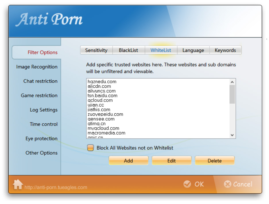 You can add, edit, and delete URLs you trust. Any URLs that are included in the whitelist will no longer be filtered by the Tueagles Anti Porn software.